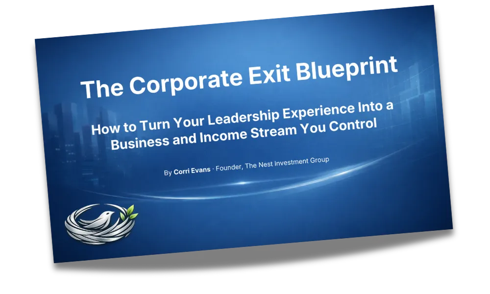Corri Evans is the founder of The Nest Investment Group and the creator of The Corporate Exit Blueprint. She empowers C-suite executive women to translate their leadership experience, expertise, and strategic thinking into profitable businesses they own. Corri is known for combining bold strategy with clarity-driven leadership development so powerful women can step into ownership on their own terms, without spending more energy or their genius on someone else’s empire.
